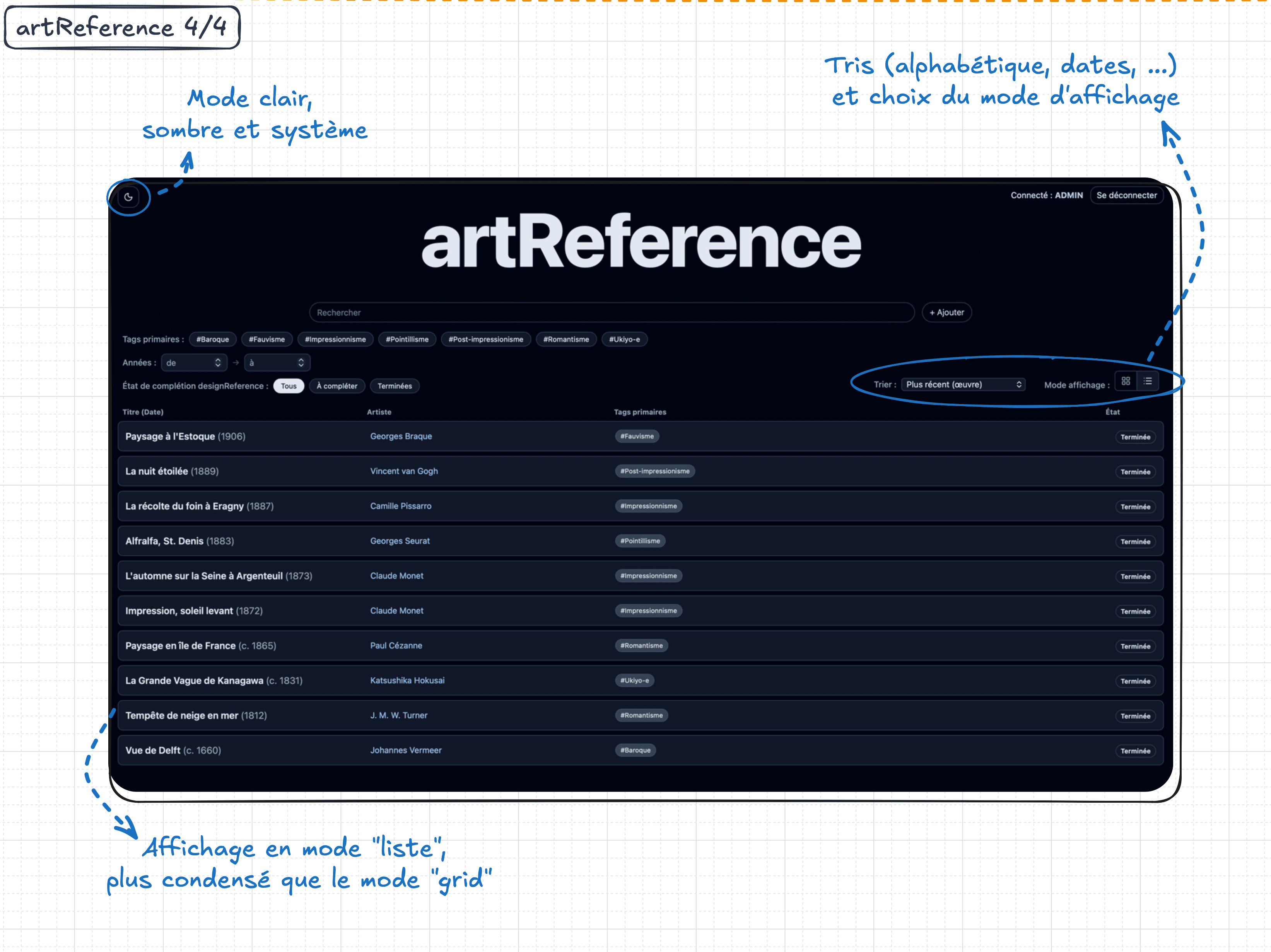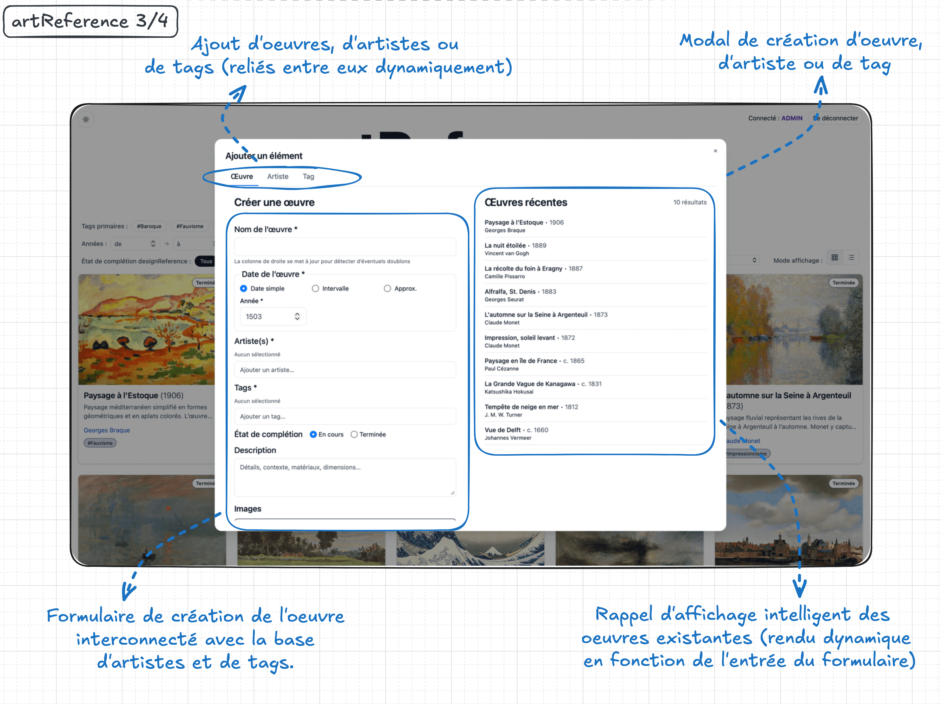 ArtReference est une application web dédiée à la gestion et à la consultation d’œuvres d'art. Elle permet de créer, modifier et organiser des œuvres, artistes, tags et images, avec des relations complexes N↔N. L’interface met l’accent sur l’UX : modales dynamiques, recherche instantanée, filtres et tris synchronisés à l’URL. La homepage est rendue en SSR pour garantir performance et SEO, grâce à Next.js App Router. Le projet intègre une authentification sécurisée par JWT (cookies HTTP-only) et une gestion de rôles (admin / visiteur). Au sujet des données, la base de données PostgreSQL est manipulée via des requêtes SQL écrites à la main, sans ORM abstrait. Les images sont gérées avec upload, variantes, galerie interactive et choix de couverture.